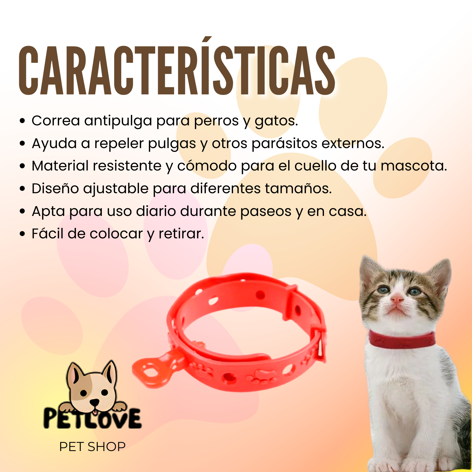 Mantén a tu mascota protegida de pulgas y otros parásitos externos con esta práctica correa antipulga. Diseñada para usarse a diario, ayuda a repeler insectos mientras tu perro o gato juega, pasea o descansa, brindándole mayor comodidad y bienestar.